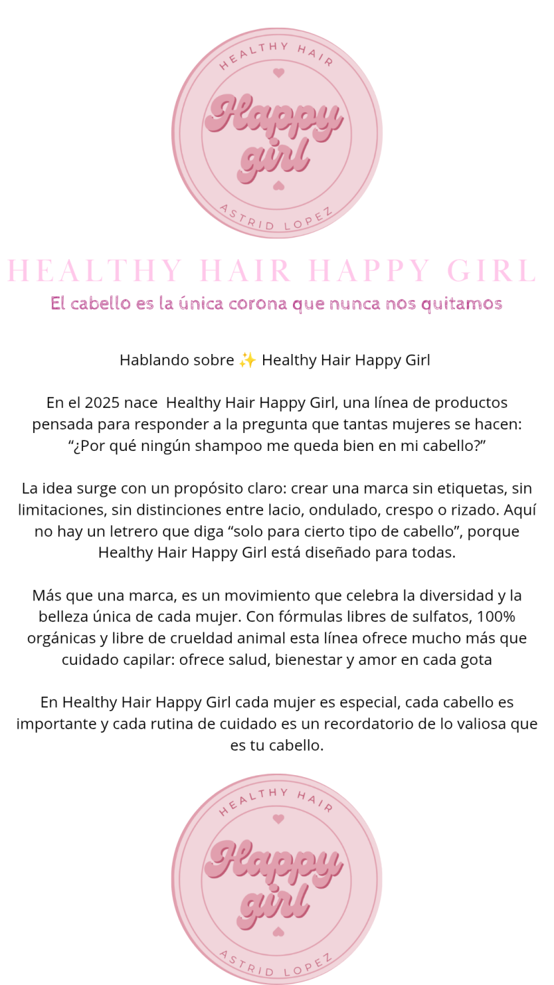 Happy Girl Healthy Hair es una tienda online especializada en productos para el cuidado capilar. Nos dedicamos a ofrecer soluciones efectivas y naturales para todo tipo de cabello. Nuestro compromiso es ayudarte a lucir un cabello sano y radiante.